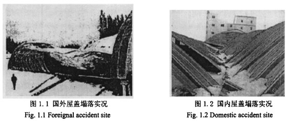 近幾年波紋拱形鋼屋蓋事故頻發(fā),使該結(jié)構(gòu)的安全性面臨很大的質(zhì)疑。圖1.1國外一落地式波紋拱屋蓋結(jié)構(gòu)在雪載下坍塌,圖1.2為1997年遼寧省鞍山地區(qū)某波紋拱屋蓋結(jié)構(gòu)在雪載下的事故現(xiàn)場。19%年12月31日夜至1997年1月1日上午,遼寧省鞍山地區(qū)出現(xiàn)暴風(fēng)雪天氣,在暴風(fēng)雪中,該地區(qū)部分大跨度拱形波紋鋼屋蓋結(jié)構(gòu)全部倒塌,直接經(jīng)濟(jì)損失約400萬元,此次事故概況如下:(l)某飼料集團(tuán)公司飼料庫房共5棟,均為MIC一240型波紋拱屋面??偨ㄖ娣e為1532lm2,于1995年9月建成投產(chǎn),此次塌落3棟庫房,建筑面積g000tnZ。其中一棟為25m+30m雙跨庫房,跨度方向?yàn)槟媳毕?庫房長102m,南跨為25m,未塌;北跨為30m,全部塌落。該棟拱腳標(biāo)高4.7m,拱頂標(biāo)高11.sm,矢高7.35m。塌落的另2棟跨度方向?yàn)闁|西向,跨度30m,庫房分別長90rn和108m。屋頂拱腳標(biāo)高4.8m,拱頂標(biāo)高為11.4m,矢高6.6m。