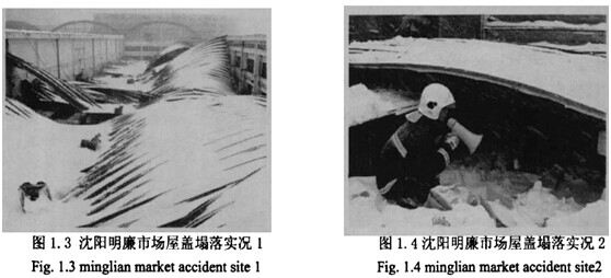 97年的風(fēng)波剛過去,2000年1月新疆、遼寧、吉林等省區(qū)又有大面積波紋拱結(jié)構(gòu)塌落,其中還包括市場等公共建筑。最近一次事故是2007年3月4日,遼寧省特大暴風(fēng)雪導(dǎo)致沈陽市皇姑區(qū)明廉農(nóng)貿(mào)市場拱形波紋頂棚坍塌,造成1死12傷(圖1.3、圖1.4)。