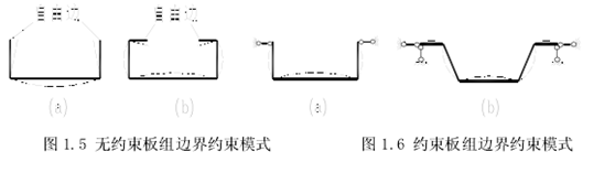 在有限元模型邊界條件的設(shè)置上,以往的學(xué)者多采用無約束板組邊界條件模式,如圖 1.5。吳麗麗、高軒能則根據(jù)拱型波紋鋼屋蓋結(jié)構(gòu)的成型特點(diǎn),采用了不同的邊界約束模式,如圖 1.6,在薄壁構(gòu)件理論分析模型的研究上具有一定的新穎性。在簡(jiǎn)單或?qū)ΨQ應(yīng)力作用下,薄壁構(gòu)件對(duì)應(yīng)前一種約束模式的板組屈曲模態(tài)一般表現(xiàn)為圖 1.5 中虛線所示的對(duì)稱形式,而對(duì)應(yīng)于圖 1.6 的邊界約束模式的屈曲模態(tài)則如圖 1.6 中虛線所示。