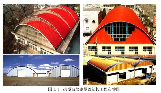 拱型波紋鋼屋蓋結(jié)構(gòu)是一種典型的冷彎薄壁輕鋼結(jié)構(gòu),由于其蘊(yùn)涵很大的經(jīng)濟(jì)及社會(huì)效益,非常適合我國經(jīng)濟(jì)飛速發(fā)展的社會(huì)主義初級階段的國情,因此在我國得到了蓬勃發(fā)展,應(yīng)用領(lǐng)域涉及廠房、倉庫、展廳、禮堂、體育館、餐廳、娛樂廳、加油站、營房、車庫以及臨時(shí)建筑等方方面面(如圖 1.1)。